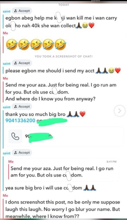 In the chat, the young man begged the DJ for money to have s3x with a pr0stitute, saying “egbon abeg help me, k0nji wan kill me, I wan carry ol*sh* nah 40k she wan collect.”