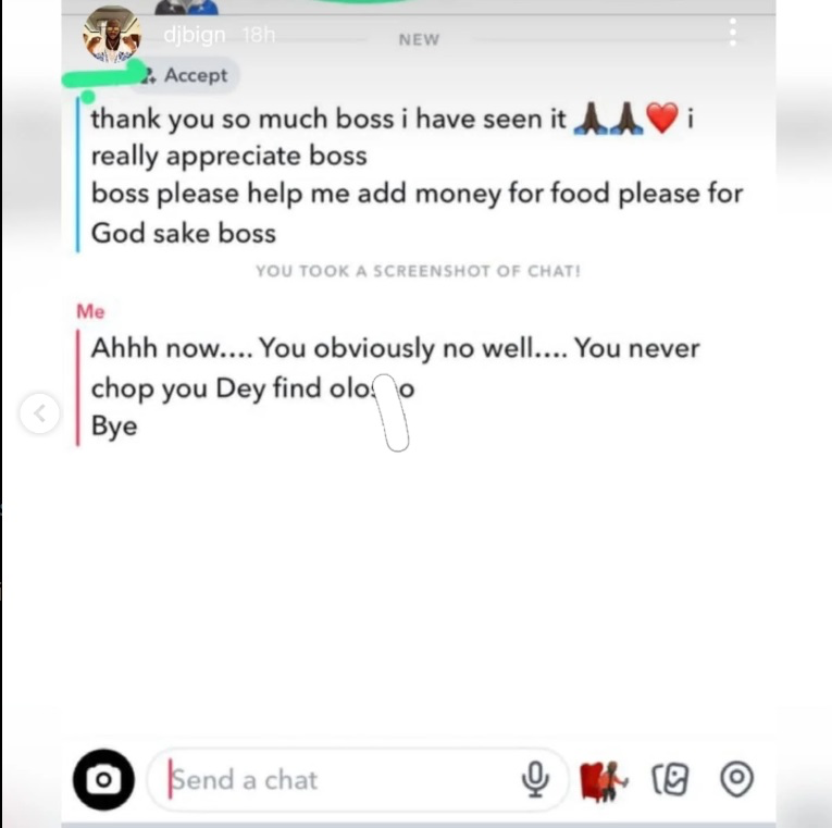 Popular Nigerian DJ, Big N, amused many fans after sharing a funny Snapchat exchange with someone who slid into his DM with an unusual request.