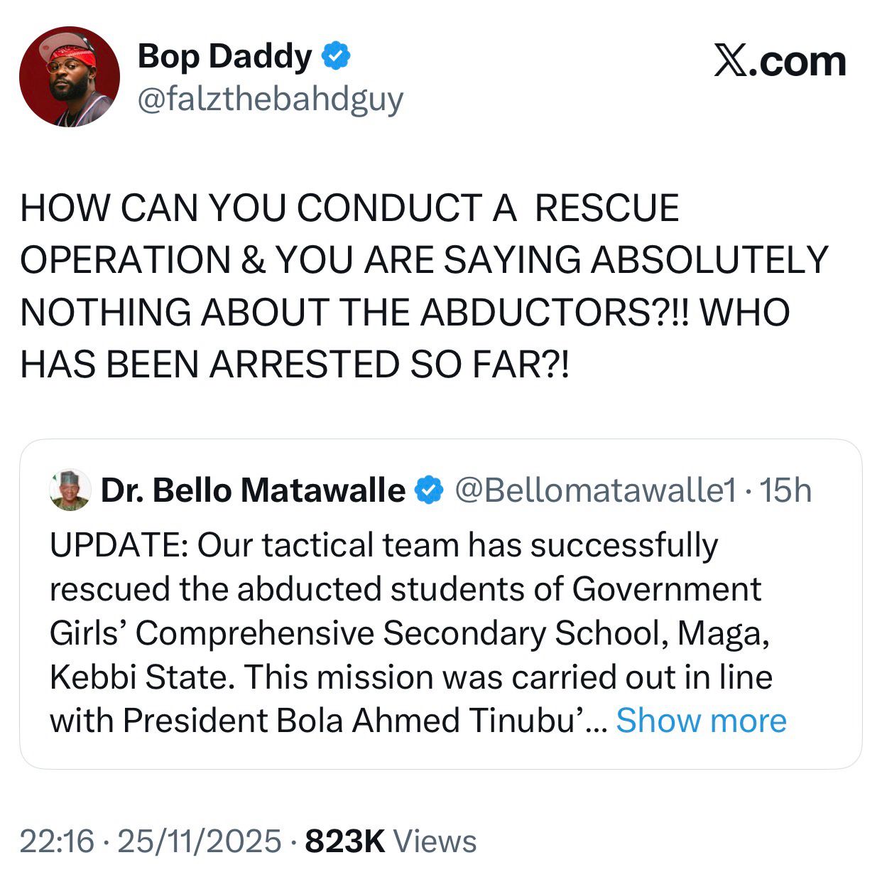 In a series of post he made on X, Falz said that the government has only informed Nigerians about the rescue of abducted victims but didnt mention if the abductors were arrested or not.