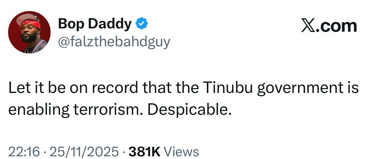 Folarin Falana, the Nigerian rapper, who is popularly known as Falz, has accused the Tinubu-led government of fostering terrorism.