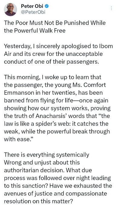 Former presidential candidate Peter Obi has criticised the decision by AON to impose a lifetime flight ban on a young passenger, Ms. Comfort Emmanson, over misconduct on board.
