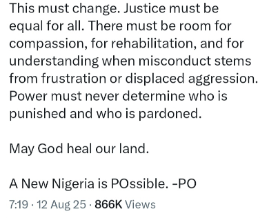 Obi argued that while the young woman’s actions were wrong, there should be space for compassion, rehabilitation, and understanding, especially when misconduct may stem from frustration or displaced aggression.