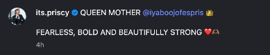 Despite the controversy, Priscilla’s tribute has been seen as a show of solidarity, with many fans applauding her for standing by her mother during a turbulent time. Supporters in the comment section echoed her words, celebrating Iyabo’s outspokenness and strength in the face of public scrutiny.